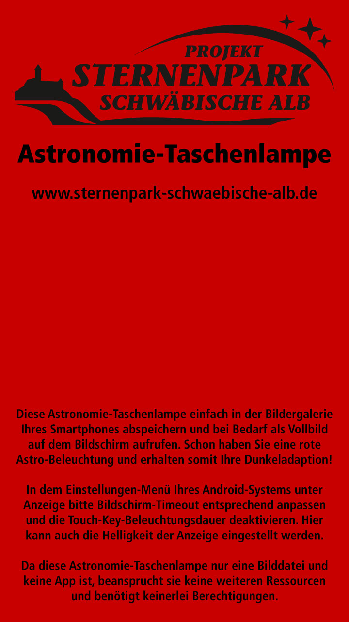 Sie finden hier Medien vom Projekt Sternenpark Schwäbische Alb, die interaktiv auf mobilen Geräten genutzt werden können. Die Verwendung der Medien ist grundsätzlich kostenlos, aber über eine "Spende" würden wir uns sehr freuen. Die Weitergabe an Dritte ist unter der Voraussetzung der Namensnennung (www.sternenpark-schwaebische-alb.de) erlaubt.