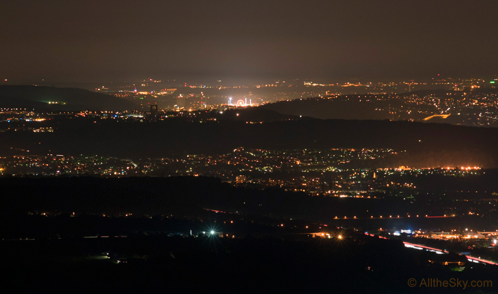 In Ditzingen strahlt eine Firma für Lasertechnik anläßlich einer Preisverleihung einen grünen Laserstrahl in den klaren Himmel und hinaus ins Weltall, 300 000 mal so hell wie ein Laserpointer (Ankündigung in der Zeitung), und auf der anderen Seite ist die Wolkendecke gleißend erhellt vom Cannstatter Volksfest - und ein Skybeamer zieht seine Kreise.