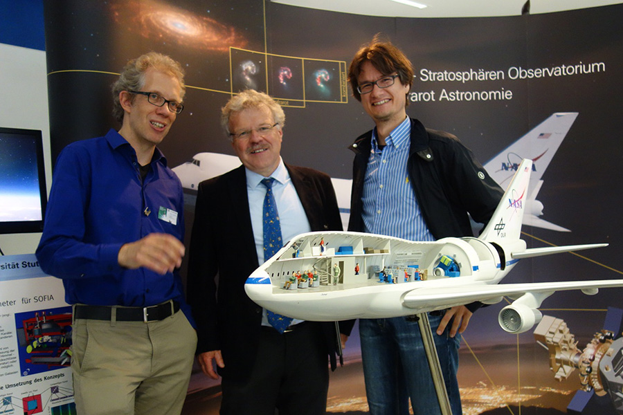StratoTill Till Credner Astronaut Reinhold Ewald und Matthias Engel vom Sternenpark ProjektIm Rahmen des Tags der Wissenschaft war "StratoTill" am Deutschen SOFIA Institut (DSI) an der Universität Stuttgart zu Gast. Er beantwortete viele Fragen der interessierten Besucher und zeigte die Zeitrafferaufnahmen des Nachthimmels, die er an Bord des SOFIA-Forschungsflugzeugs über den USA erstellt hat. Diese Aufnahmen begeisterten auch Astronaut Reinhold Ewald, der als Professor am Institut für Raumfahrtsysteme lehrt und am SOFIA-Stand zu Besuch war.