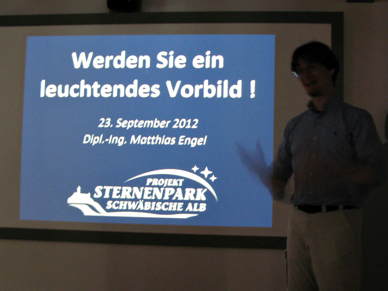 Anlässlich des Energietags Baden-Württemberg 2012 hat das Sternenpark-Projekt am 23.9. in Münsingen eine Ausstellung und einen Vortrag zum Thema "Umweltgerechte Beleuchtung" veranstaltet. Im Foyer des gut besuchten Biosphärenzentrums Schwäbische Alb waren die neuen Tafeln zum Thema Beleuchtung zu sehen und es wurden Beleuchtungmodelle und beeindruckende Filme vom Sternenhimmel über der Alb gezeigt. In seinem Vortrag mit dem Titel "Werden Sie ein leuchtendes Vorbild!" erläuterte Matthias Engel vom Sternenpark-Projekt die Problematik der Lichtverschmutzung und zeigte praktikable Lösungsmöglichkeiten: Voll abgeschirmte Straßenbeleuchtung, maßvoll eingesetzt, mit warmweißen und energieeffizienten Leuchtmitteln, reduziert die Lichtverschmutzung deutlich und spart Energie und Steuergeld, bei Erhöhung des Beleuchtungskomforts. Diese Beleuchtungsgrundlagen sollten die Gemeinden unbedingt beachten, um jetzt bei einer Umrüstung nicht in falsche Technologie zu investieren. Eine interessante Diskussion zu neuer Lichttechnik rundete den Vortrag ab.